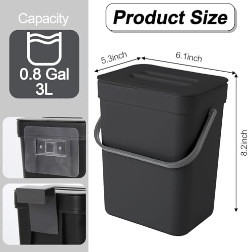 ?Premium Material & Enough Capacity?: This small hanging garbage can with lid is made of high density polypropylene, non-toxic and tasteless, sturdy and durable; Dimension: 8.2 * 6.1 * 5.3 inch, capacity: 0.8 gallon; The kitchen pail is easy to clean with soap and water, no crevices for dirt, grime or liquids to get trapped. The ring on the compost bin helps to prevent the bin liners from slipping down.
