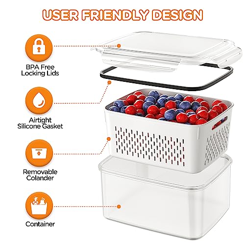 ?4 in 1 Food Storage Containers? The fruit storage for fridge are double-layered, both with a removable colanders for easy rinsing and filtering out the water on the surface of vegetables and fruits to reduce food spoilage. Produce stays fresh noticeably longer for two times. Combined soaking, washing, draining and storage functions, makes your life easier.