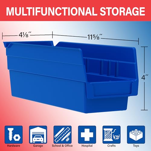 VERSATILE STORAGE CONTAINERS: Akro-Mils Shelf Bins are great for any space; Use them on shelves, as an under sink organizer, cabinet organizer, or for garage storage; Bins fit with 12", 18", and 24" deep storage shelves, vertical storage, and pick racks