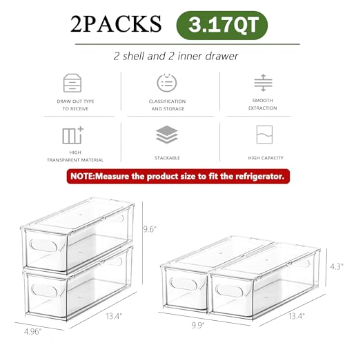 ????????????????????????????? ????????????????????????????? Measures 1 Package includes 2 shell and 2 inner drawer. Two identical 3.17-quart (13.4"L x 4.96"W x 4.3"H)drawer storage boxes can meet all your needs.Do not place the plastic storage bins in dishwasher.(Please confirm the size is suitable for your fridge.)