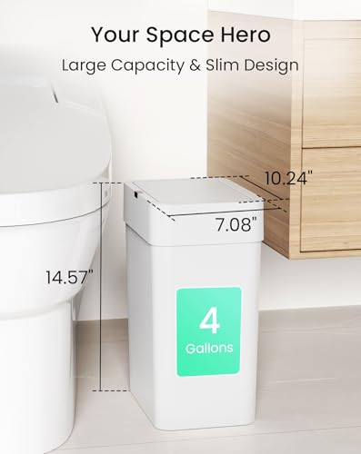 Slim Yet Spacious Design: Our smart trash can’s compact design fits tight spaces like narrow gaps between toilets or beside furniture, while the large 10.24 x 7.08 x 14.57 inches size allows it to hold up to 4 gallons of waste.
