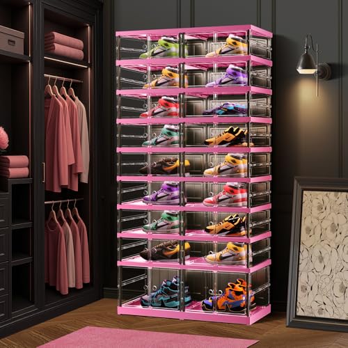 Quick Installation: Collapsible plastic shoe boxes with lids is use integrated structure design, without any assembly tools.You can put it on the floor and pull it open like an accordion, that you can get a new foldable shoe box. Clear shoe boxes organizers your shoes with a minimal and modern style that blends with your room decor. Even a small space in the corner of the room will become elegant