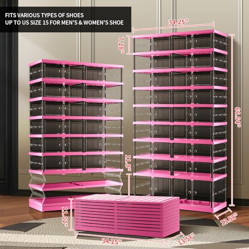 Organizer Storage: The shoe rack for closet expandable size: 34.25"L*13.58"W*66.54"H(Fold 11.02"H), including 9 Tiers(16Grids+2Large grids). Shoe rack for entryway can accommodate up to 36 pairs of shoes. Stackable shoe rack fits all types of shoes and can store men's and women's shoes up to size 15. Foldable shoe racks has a 2-Large grid heightened design, suitable for storing long boots