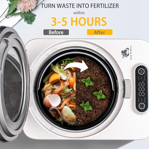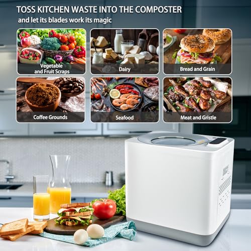 Designed For Home:The size of the electric kitchen composter is 13.4” L x 10.4” W x 13.2” H,saving space but providing 3.8 L large capacity.The handle of the basket is insulated to prevent burns.Professional noise handling, running sound below 45 dB
