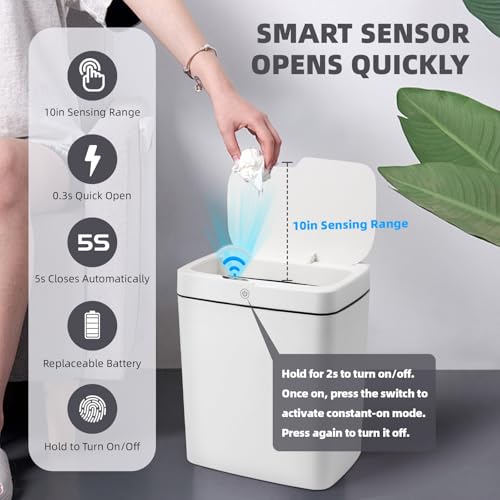 SMART MOTION SENSOR TRASH CAN: Our bathroom trash can is equipped with sensing technology, reducing unnecessary openings and extending battery life. Simply place your hand above the infrared motion sensor, and the lid will stay open for your convenience. After 5 seconds of inactivity, the lid automatically closes to conserve energy.