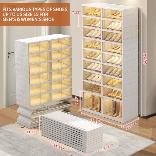 Tall Boots Storage Design: The expandable size of the plastics foldable shoe racks organizer: 34.25"L* 13.58"W *66.54"H, including 9 Tiers(16Grids + 2Large grids). Shoe organizer for closet can accommodate up to 36 pairs of shoes. Multi-layer shoe rack storage organizer fits all types of shoes and can store men's and women's shoes up to size 15. Closet shoe rack for entryway has a 2-Large grids heightened design, suitable for storing long boots