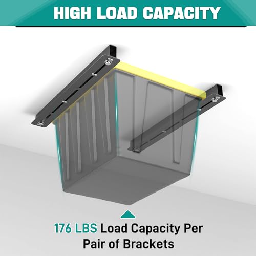 Heavy Duty Steel: Made of high-quality steel, this garage ceiling storage system is built for heavy-duty storage with durability. Each set holds up to 176 lbs, perfect for storing seasonal gear, tools, bags, and more
