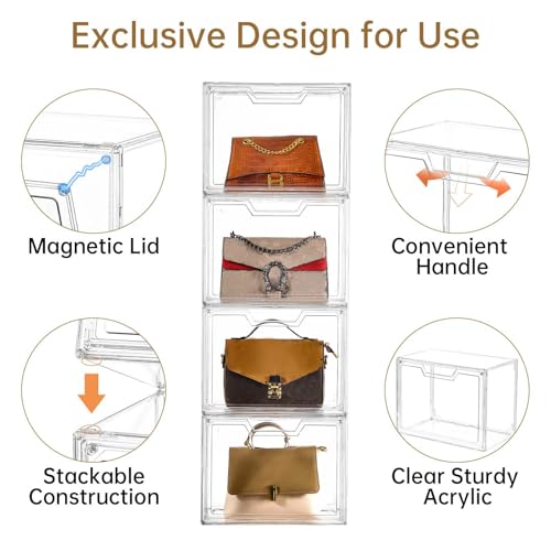 Stackable Slots Design?The top and side of the acrylic box feature two small slots, which can be used for connecting and fixing multiple acrylic boxes. This design allows multiple storage bins with lids to be combined into a single storage cabinet or display wall.The stackable storage bins are perfect for storing a variety of handbags and doubles as a display case for anime collectibles and room decor, enhancing your home's aesthetics. They can also be used for cosmetics, clothing, and other household items.