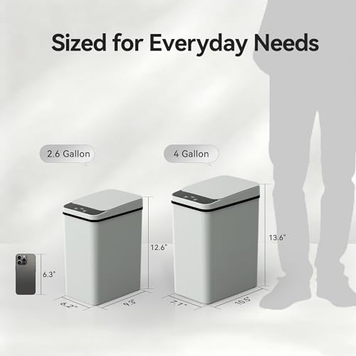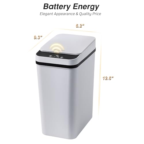 SMALL TRASH CAN: The 2.6 gallon bathroom trash can is highly suitable for relatively narrow spaces, with dimensions of 9.3"L x 6.2"W x 12.6"H, it doesn't look very big, and customers will need to install 2 AA batteries (not included)