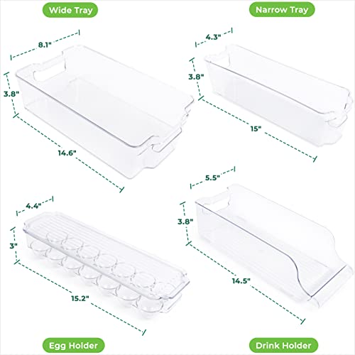 Multiple Sizes: The set features various bins including an egg holder for 14 eggs, a fridge drink organizer for 9 standard cans, plus wide and narrow containers for flexibility and customization