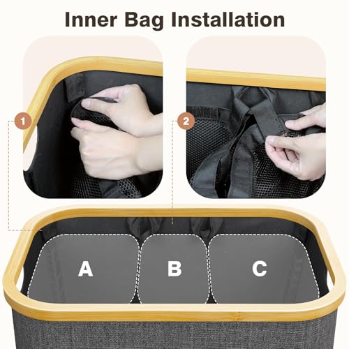 Easy to Transport: The laundry hamper with lid is crafted with smooth bamboo frame and rounded handles on both sides, supporting up to 44 lbs. Our Bathola laundry bin is sturdy and easy to move. It includes three separate, removable, and machine-washable inner bags, offering you greater flexibility to organize your laundry, with the convenience of removing them individually for cleaning
