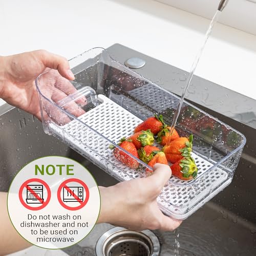 ?Drainage Design?Fruit storage containers for fridge feature drain tray and drain holes at the bottom, Ideal for producing storage. This is especially useful when you wash fruits and vegetables. The excess water can be easily drained, preventing liquid build-up and keeping your food fresh