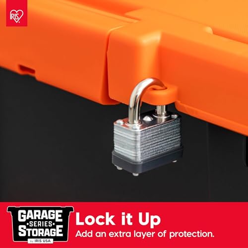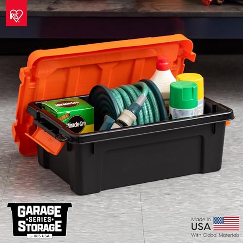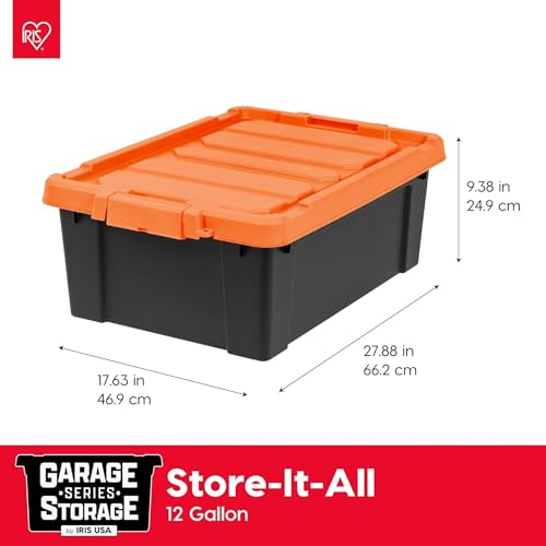 IRIS USA 12 Gallon Lockable Storage Bins with Lids, 2 Pack - Made in USA, Heavy Duty, Stackable Containers, Garage Organizing Bins Moving Tubs, Rugged Sturdy Equipment Utility Box - Black/Orange