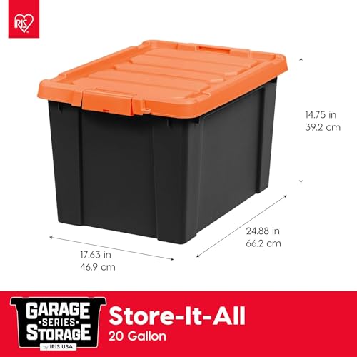 IRIS USA 20 Gallon Lockable Storage Bins with Lids, 2 Pack - Made in USA, Heavy Duty, Stackable Containers, Garage Organizing Bins Moving Tubs, Rugged Sturdy Equipment Utility Box - Black/Orange