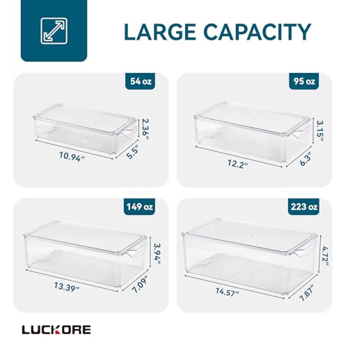 Large Capacity: The set of 4 refrigerator organizer bins features varying size capacities, with a maximum capacity of 223oz, medium 149oz and 95oz, and a minimum capacity of 54oz. This design allows for the accommodation of both small and large items to fulfill diverse storage needs