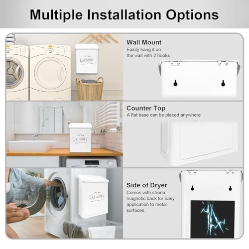 Space-saving: Powerful full-back magnets and wall-mounted adhesive hooks that attach directly to the side of your metal washer or dryer. You can also attach it to the wall with screws or sticky hooks. Or you can put it in the dryer or on the laundry room counter, perfectly saving your laundry room space than the trash can