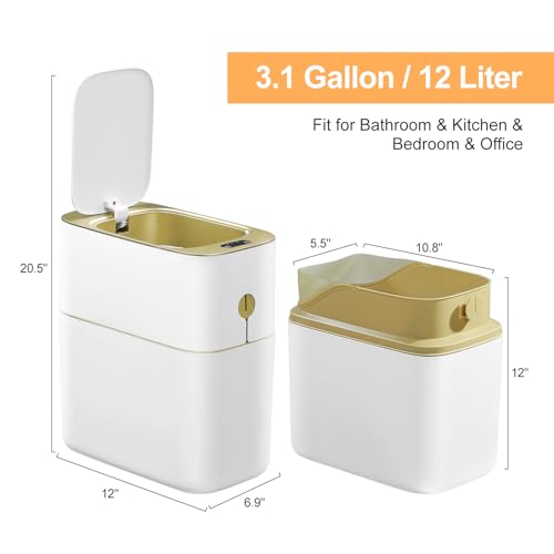 SPECIFICALLY DESIGNED FOR SMALL SPACES: The size of this small bathroom trash can with lid: 12.1 inch * 6.9 inch * 13.2 inch, 13L / 3.1 gallon, make it ideal for small spaces, like bathrooms, RVs, kitchens, living rooms, bedrooms etc. The slim shape fit perfectly into the narrow space between vanity and toilet