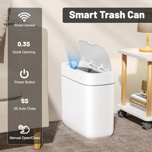 Automatic Trash Can - Our electric bathroom smart sensor trash can is equipped with a SOC-sensitive sensor chip, enabling the lid to open quickly in 0.3 seconds, greatly enhancing convenience and sensitivity.A minimum stay of one second is required. Whether you bend your knees or wave your hand, it can sense the motion, avoiding the spread of bacteria caused by frequent use of traditional trash cans, and effectively preventing pets from rummaging through the automatic trash can.