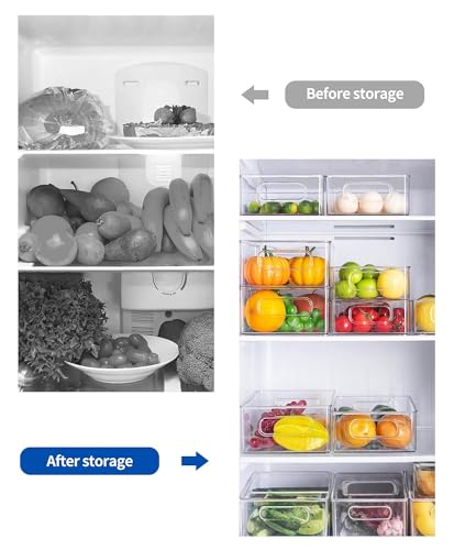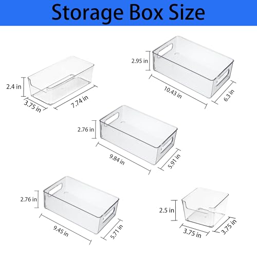 6 Pack Fridge Organizer Bins Set : Three refrigerator organizers and storage (10.43 * 6.3 * 2.95 in X 1, 9.84*5.91*2.76 in X 1, 9.45*5.71*2.76 in X 1, 7.74*3.75*2.4 in X 1, 3.75*3.75*2.5 in X2) These clear organizer bins are suitable for manage various of food in your fridge. perfect for fruits, snacks, condiments, or frozen goods. Maximize space in refrigerators, freezers, pantries, or cabinets without overcrowding shelves.