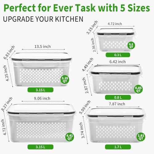 5 Size Fit Your Needs?Our produce saver containers set comes in five different sizes. Include 5 pack of X-Large size 4.41 QT(4.15L), large size 3.35 QT (3.15L), medium size 1.81 QT(1.7L), small size 0.85 QT(0.8L), and mini size 0.3 QT(0.3L). Large capacity, suitable for transporting vegetables, fruits, meals, as snacks or bread box on the go
