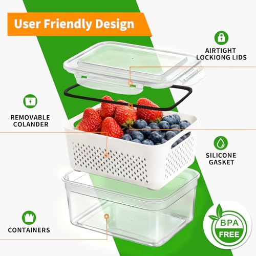 Keep Food Fresh for Longer: The side-locking lids with silicone gasket make these freezer storage containers with the colanders airtight.Each container has a removable colander, which effectively separates fruits from water, ensuring you enjoy fresh fruits for longer periods without worrying about leaks and reducing shopping frequency