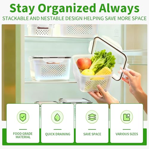 Effortless Usage Design: These multifunctional fridge fruit storage containers simplify your kitchen routine by offering a 4-in-1 function: soaking, washing, praining, and storage. Designed for easy opening and handling, they make pre-treatment and cleaning of food more convenient, saving you time and effort during meal preparation
