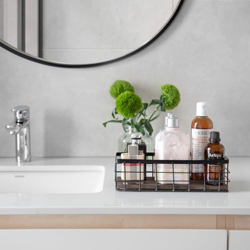 ?Countertop or Wall Mounted Storage?: This black metal basket with a wooden base offers practicality at its best. Whether hung on the wall with the included hooks or placed on any surface as a counter organizer, it's an ideal solution for organizing toiletries in the bathroom, spices in the kitchen, or even as a makeup organizer on vanities
