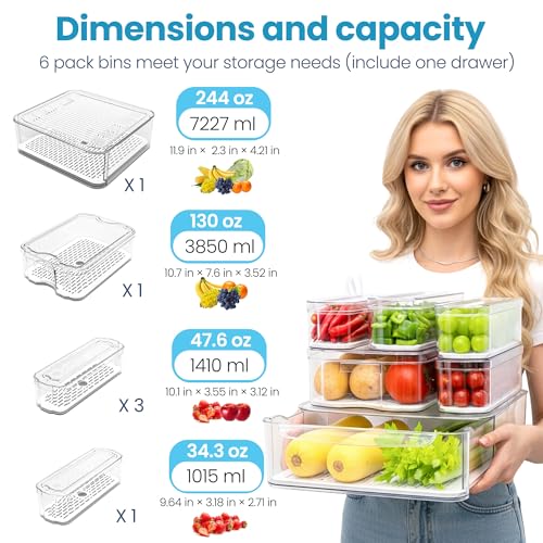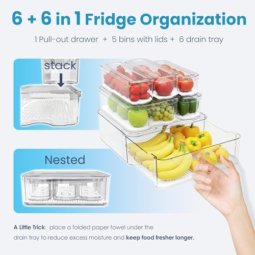 [Practical Sizes] 6-piece set: 1 pull-out drawer(11.9 x 12.4 x 4.2'') + 1 large (10.7×7.6×3.5”) + 3 medium (10.1×3.6×3.1”) + 1 small(9.6 x 3.2 x 2.7''). Fits diverse foods like grapes, carrots, cereals, and cheeses. Optimizes airflow to preserve texture.