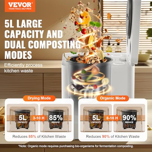 TWO OPERATING MODES: This counter kitchen composter features sharp blades for quick grinding. In pre-compost mode, it reduces kitchen waste by ?85% in 3-10 hours; in bio-compost mode, it reduces waste by ?90% in 8-20 hours. With a 5L capacity, it handles 1-2 days of household waste, easing your disposal burden.