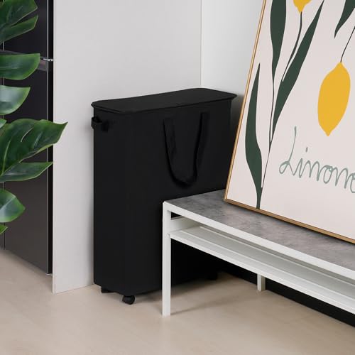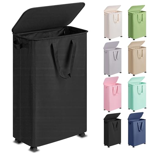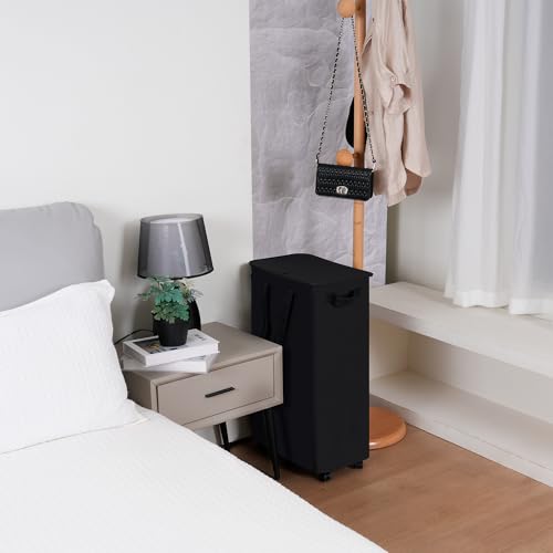 ?Slim and Rolling Laundry Hamper with Lid?Our slender, rolling laundry hamper is designed to fit perfectly in small spaces, making it ideal for bathroom, apartments, dorm, and kids' room. The tall and narrow design allows it to be placed in corners or skinny closets without taking up too much room.