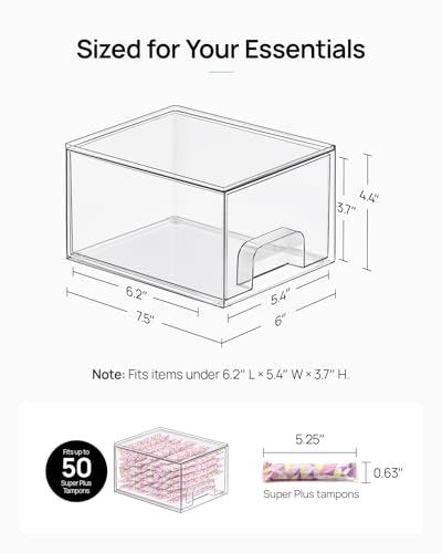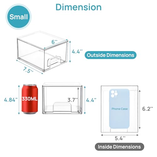[Stackable Design] Come with 4 drawer storage organizers, the outside box measures 7.5"D x 6"W x 4.4"H,the drawer measures 7.1"D x 5.6"W x 3.7"H,it is usable size. Please measure the space of using before purchasing.The storage containers are stackable, vertical storage will save a lot of space. You can also use them side by side. Put your small objects on top of acrylic bins to make your countertop space more tidy.