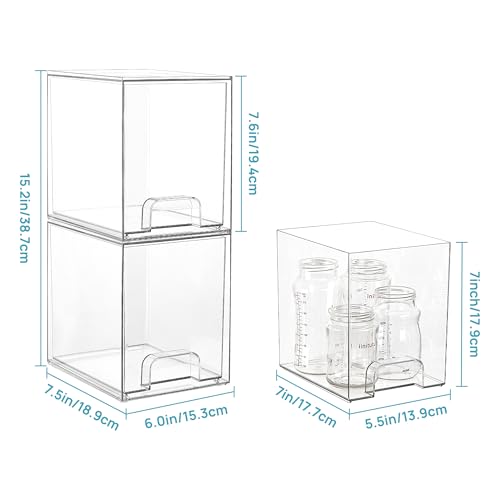 [Stackable Design] Come with 4 drawer storage organizers, each organizer measures 7.5"D x 6"W x 7.6"H. Vertical storage will save a lot of space. You can put other objects on top of acrylic bins to make your countertop and cabinet space more tidy. It can also be stacked with Vtopmart storage drawers of other sizes.
