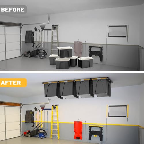 Effortless Overhead Storage: Garage ceiling tote storage system install securely to 16" or 24" ceiling joints for swift, hassle-free mounting. Ceiling tote storage rails fit common bins(bins not included) for quick and easy storage