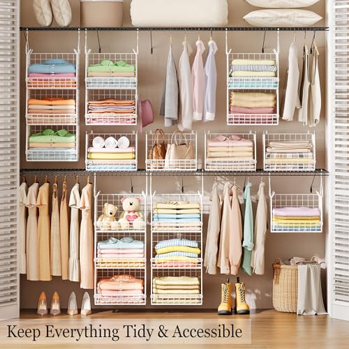3 in 1 or Use Alone: X-cosrack closet hanging organizer is the layered design, used alone or stacked according to your own need and idea. And you can screw all the three baskets together and hang them as a unit on the closet rod to store clothes, hats, sweaters, jeans, shirts, shoes, purses and other accessories. Also, you can hang 2 baskets on the wall, and place 1 on the shelf. You can DIY the using methods.