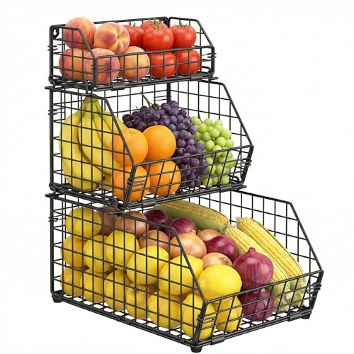 Versatile Organizer: 3-tier different-size wire baskets meet your various storage need for different items. Use them as onion and potato storage bins, fruit and vegetable baskets, produce baskets, snack holder, canned food rack, bread basket, spice jars shelf, etc.; perfect for kitchen, cabinet or pantry room organization and storage.