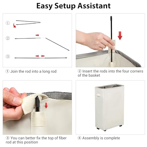 COLLAPSIBLE LAUNDRY BASKET- 4 sturdy fiberglass shafts and metal frame not only confirm the steadiness during usage, also can be removed to fold the basket while not using. The folded size of our slim laundry hamper is 15×8×2 inches, the slim and tall feature saves much more room by placing behind the door, or else