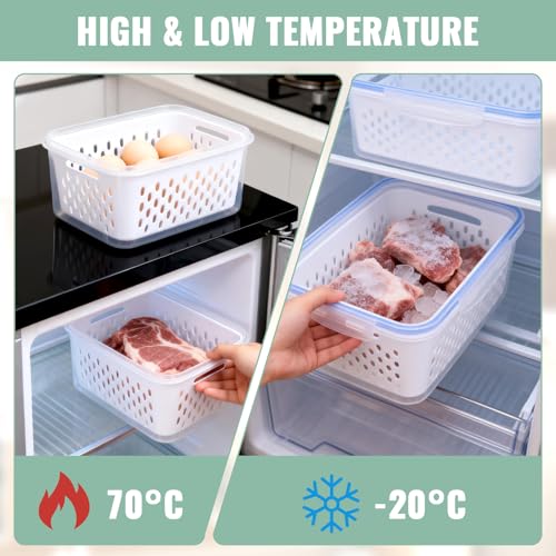 ?Keep your fruits fresher longer?:The refrigerator organizer bins have a sealed environment which constructed by sealing ring and locking buckles to prevent the loss of water in food. The interior basket allows water to fall away from the fruit and be kept within the container but away from the food. They can be used to store many types of fruits or vegetables, such as lettuce, tomatoes, strawberry, and grapes. Reduce the messy refrigerator storage, and save more space structure for the fridge and easy to carry making them ideal for outdoor activities such as picnics, camping or road trips.